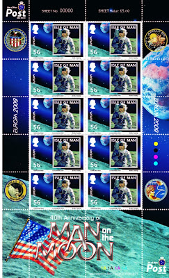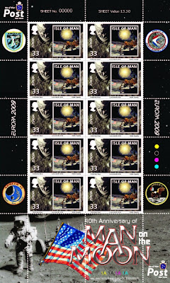 In 2019, the Isle of Man, in order to celebrate the "50th anniversary year of the first manned flight to land on the Moon", issued one commemorative sheetlet of 11 stamps - the middle stamp of the last row is a reprint of the 2009 Europa stamp (0.56 GBP) with a 2019 indication.